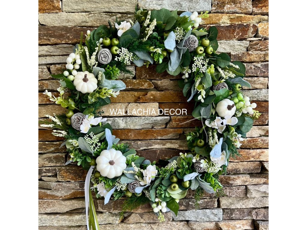 Obrovský věnec s podzimním nádech v bílých tónech je nadčasový! Díky trvanlivému materiálu vydrží věčnost.